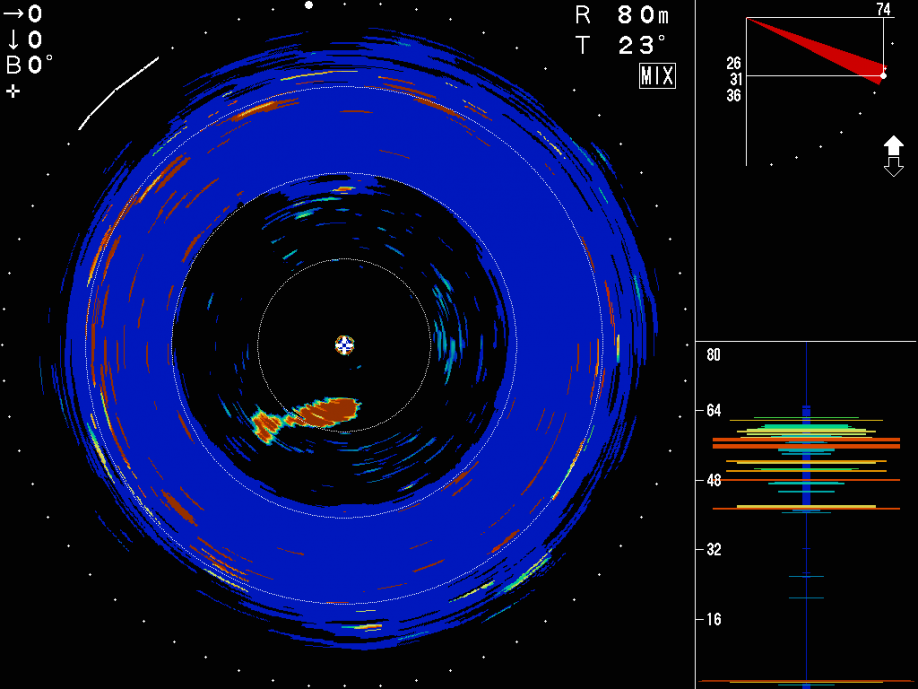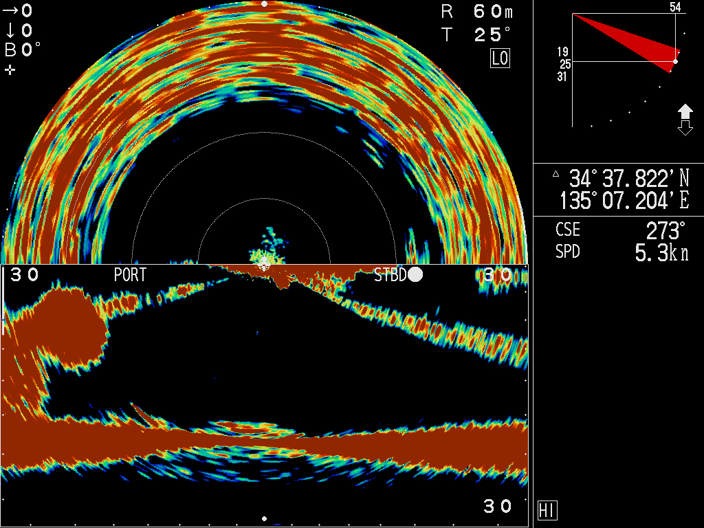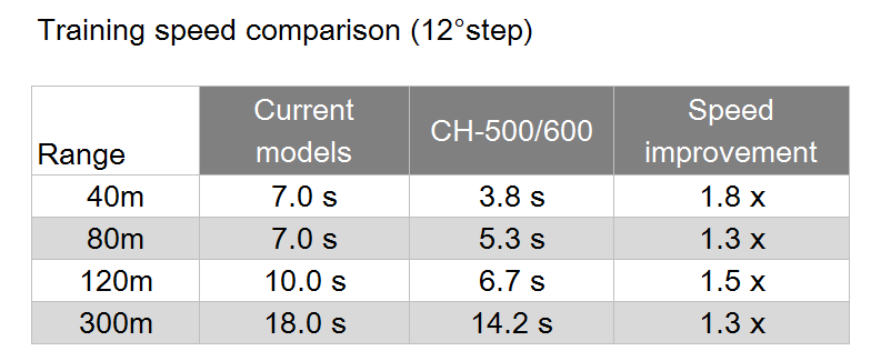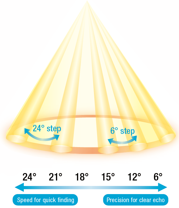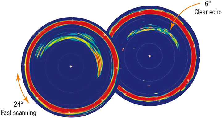CH-500/600 sónarinn er afkastamesti og hraðvirkasti sónarinn í sínum stærðarflokki. Velja má á milli 6 geislabreidda við skönnun (6°, 12°, 15°, 18°, 21° og 24°) á hámarks hraða og breidd valinna sneiða frá 24° til 360°. Aðeins örfáar sekúndur tekur að skanna alla sneiðina. Þessi mikla hraðvirkni CH-500/600 sónarsins gerir skipstjóranum kleift að skanna stór svæði á afar stuttum og árangursríkum tíma. Ábending: Þegar skipið er á mikilli ferð er hagstætt að nota 24° geislabreidd við skönnun. Þannig eru líkurnar mestar á því að menn missi ekki af torfu. Þegar endurvarp frá torfu skilar sér stilla menn sónarinn á þrengri geislabreidd og hægja á skipinu til að fá nákvæmari upplýsingar um torfuna.