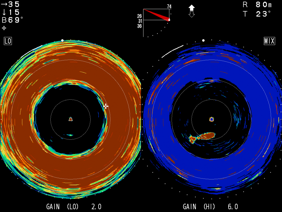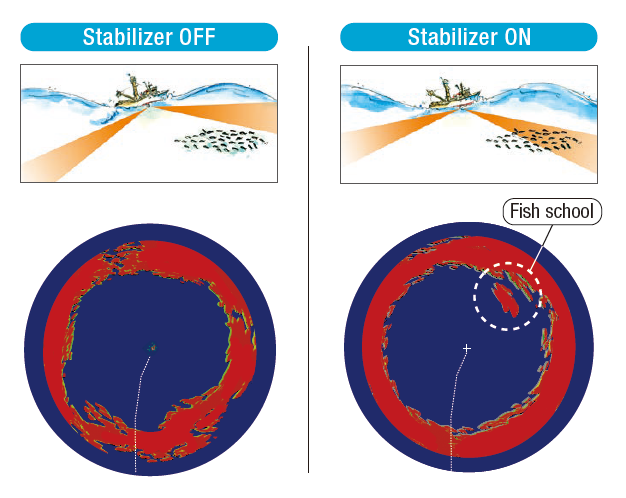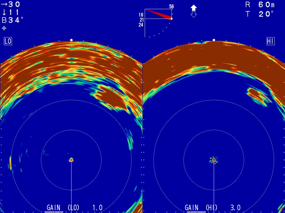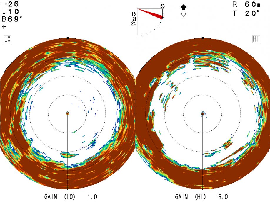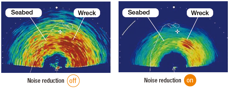 Á myndinni hægra megin hér að ofan sést að þegar hreyfiskynjarinn er virkur helst lögun botnsins hringlaga. Þá veitir sónarinn réttar og nákvæmar upplýsingar þó veður sé vont. Eins og sjá má með samanburði við myndina vinstra megin, þar sem hreyfiskynjari er ekki til staðar eða er óvirkur, greinir sónarinn fiskitorfu með virkum hreyfiskynjara í vondu veðri, en ekki þegar hreyfiskynjarinn er óvirkur. Í CH-500/600 sónarnum er sérstök stilling (Noise reduction) til að aðgreina endurvörp eftir eðli þeirra. Á myndunum tveimur hér fyrir neðan er dæmi um það hvernig þessi stilling gagnast við það að greina skipsflak frá botninum.