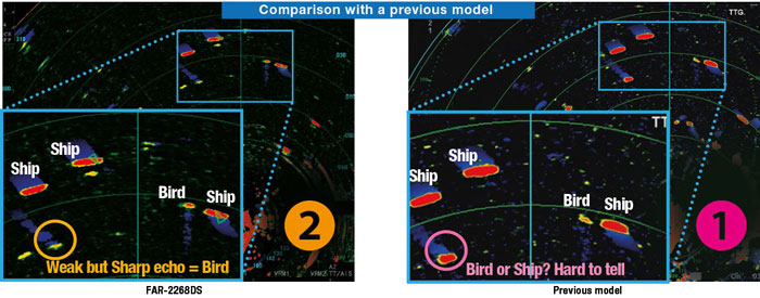 FAR-2268DS ratsjáin er með nýrri gerð móttakara og nýrri tækni til að minnka suð og truflanir. Veikustu endurvörp birtast greinileg á skjánum.