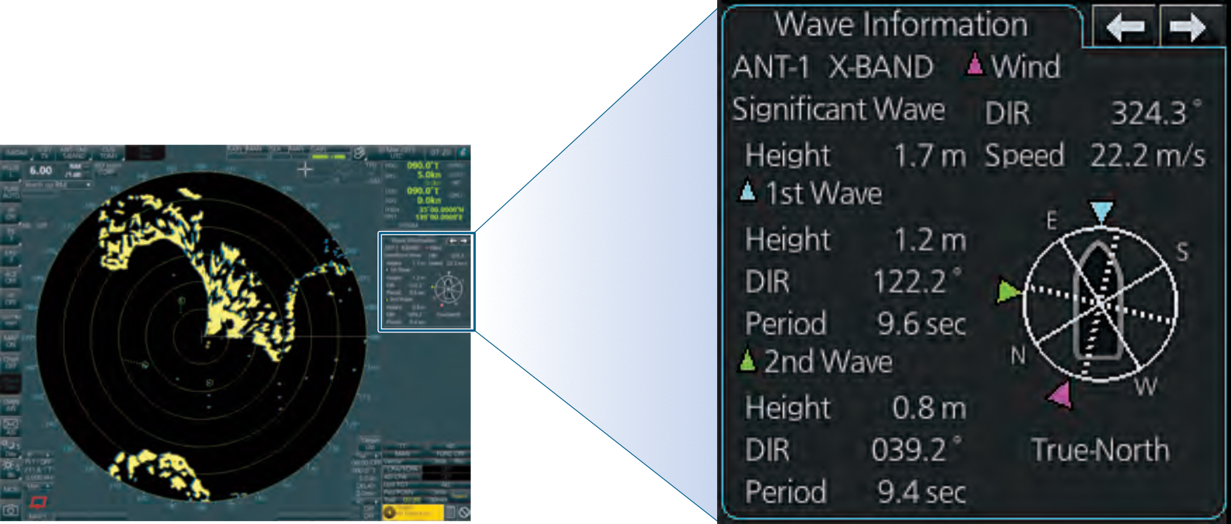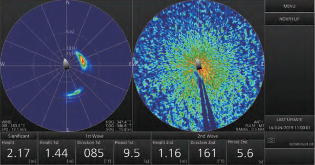 Rauntíma upplýsingar um ölduhæð, hraða, stefnu og tíma milli alda birtist á skjánum bæði tölulega og myndrænt. Þessar upplýsingar auka öryggi skips á siglingu, ekki síst í myrkri.